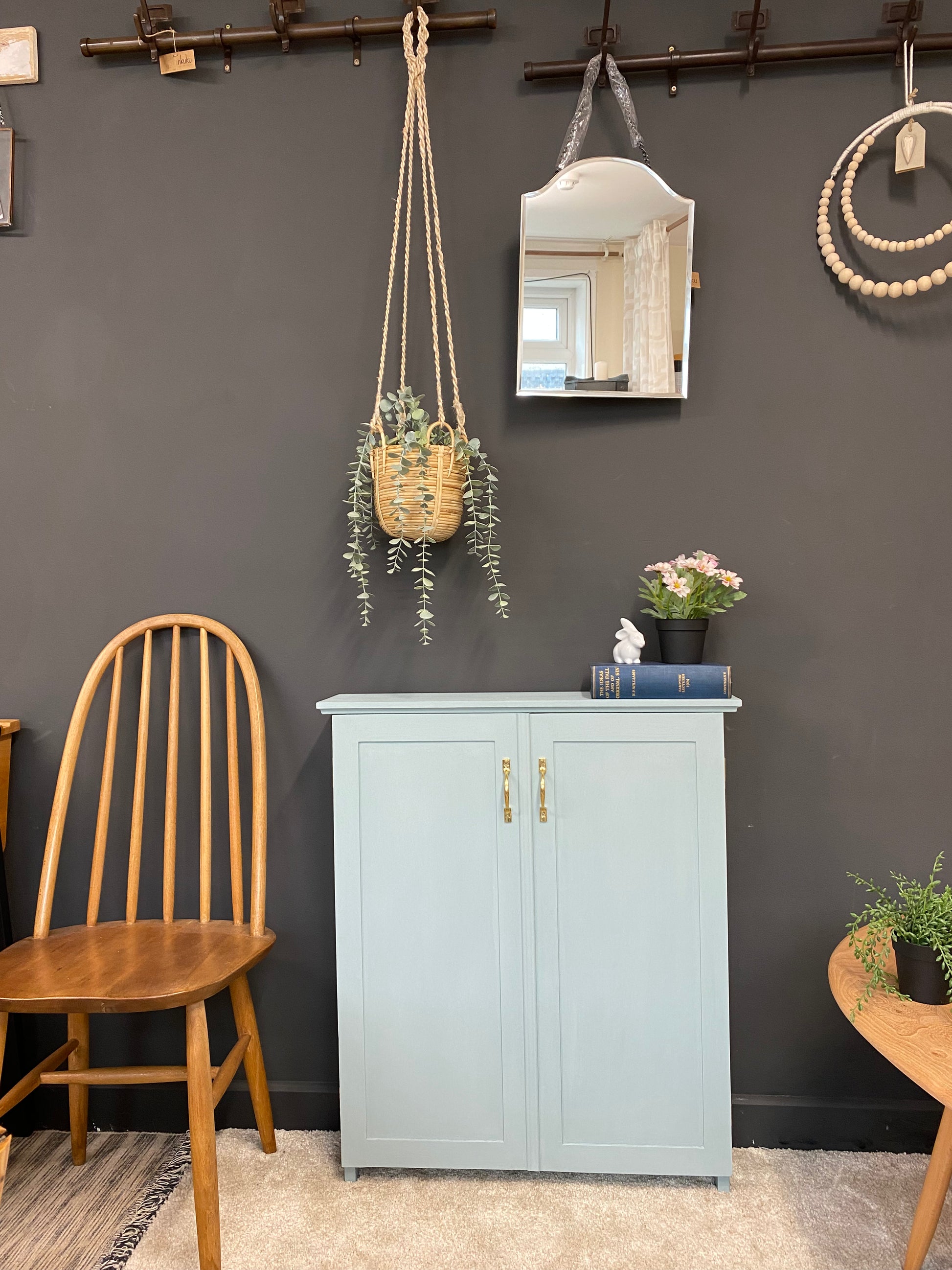 Painted in a pale duck egg blue, the addition of traditional brass handles finish the piece.